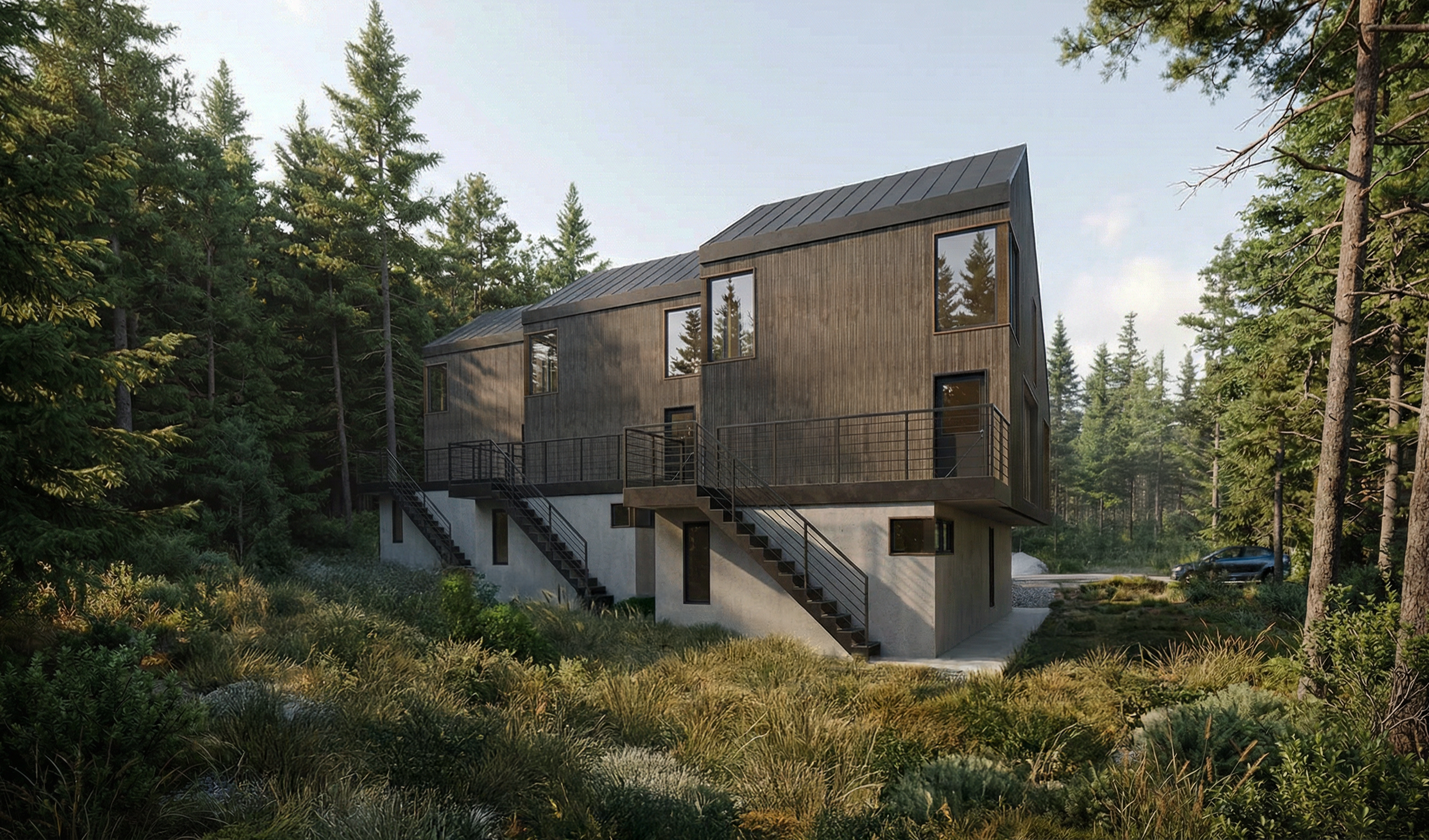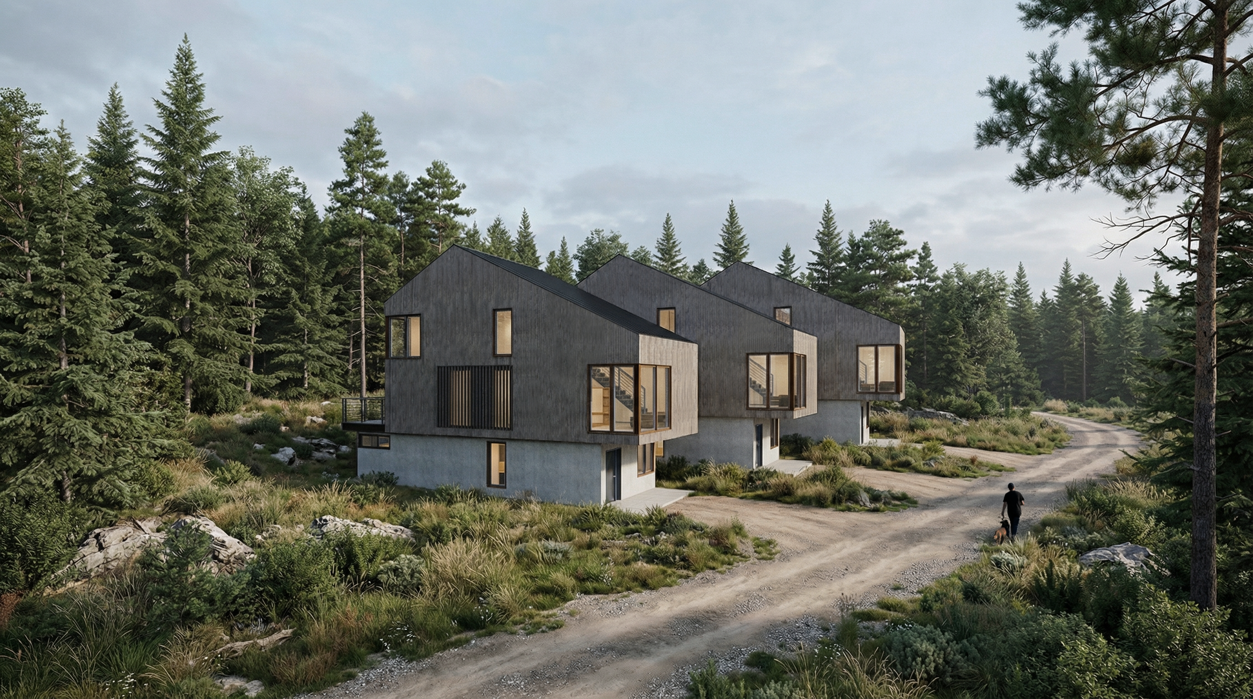 Terence Bay Townhomes is conceived as a response to the growing demand for housing in Terence Bay, Nova Scotia. The project consists of three stacked townhome buildings, each arranged with a one-bedroom unit at grade and a two-bedroom unit above. This configuration introduces six new homes into the community in a way that is both efficient and respectful, increasing housing choice while maintaining the rhythm of the surrounding neighbourhood.